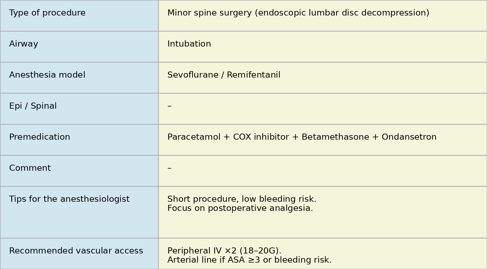 Minor spine surgery (disc herniation/endoscopic, decompression)
