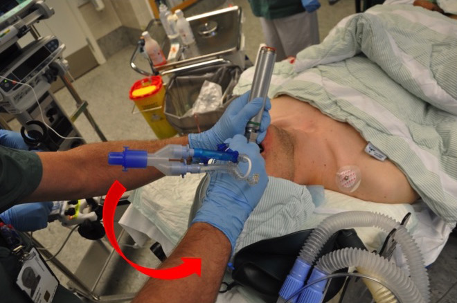 Intubation with a DLT is performed in the usual way using a laryngoscope. The accompanying guide allows the distal bronchial part of the tube to be slightly flexed, starting with the tip pointing anteriorly to facilitate intubation. Once the proximal tracheal cuff passes the vocal cords, the tube must be rotated a quarter turn counterclockwise (left tube) or clockwise (right tube) before fully advancing the tube. Figures 5 and 6 show intubation with a left tube. The guide is removed if it hasn’t been already, the tube ports are sealed, and the cuffs are inflated. At this point, the tube depth is checked using the distance markings on the side of the tube. For most patients, the distance to the front teeth is about 29 cm. Patient height plays a role, with deeper placement in taller patients and shallower placement in shorter ones.