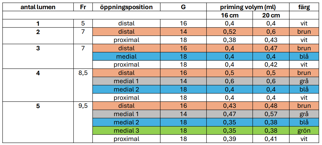 CVC catheters come in different lengths, typically 16 or 20 cm, and with varying lumen counts, between one and five lumens. A single-lumen catheter is most commonly used for intravenous access in regular hospital wards, while 3-5 lumen catheters are used for multiple accesses in ICU. Longer catheters, 30-35 cm, are needed for placement in the groin.